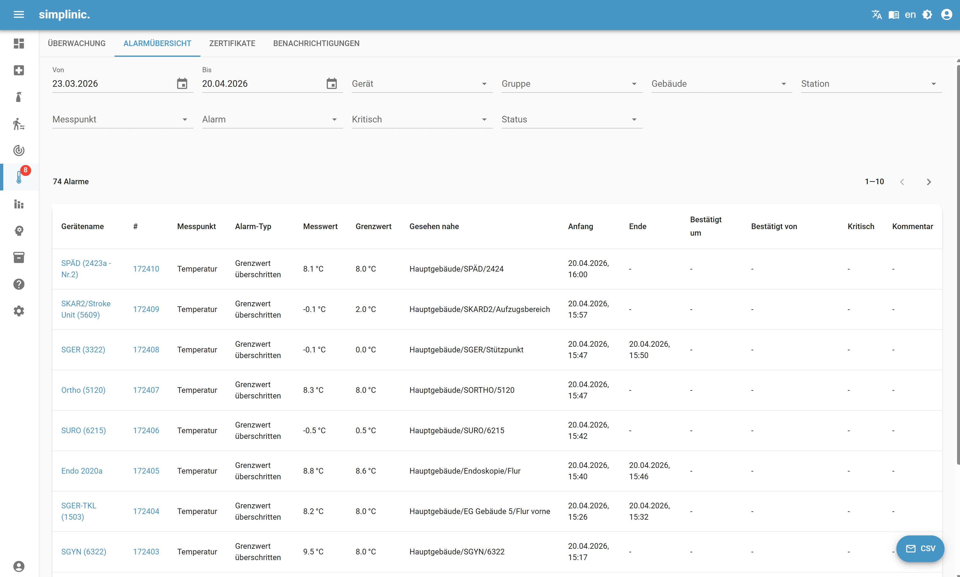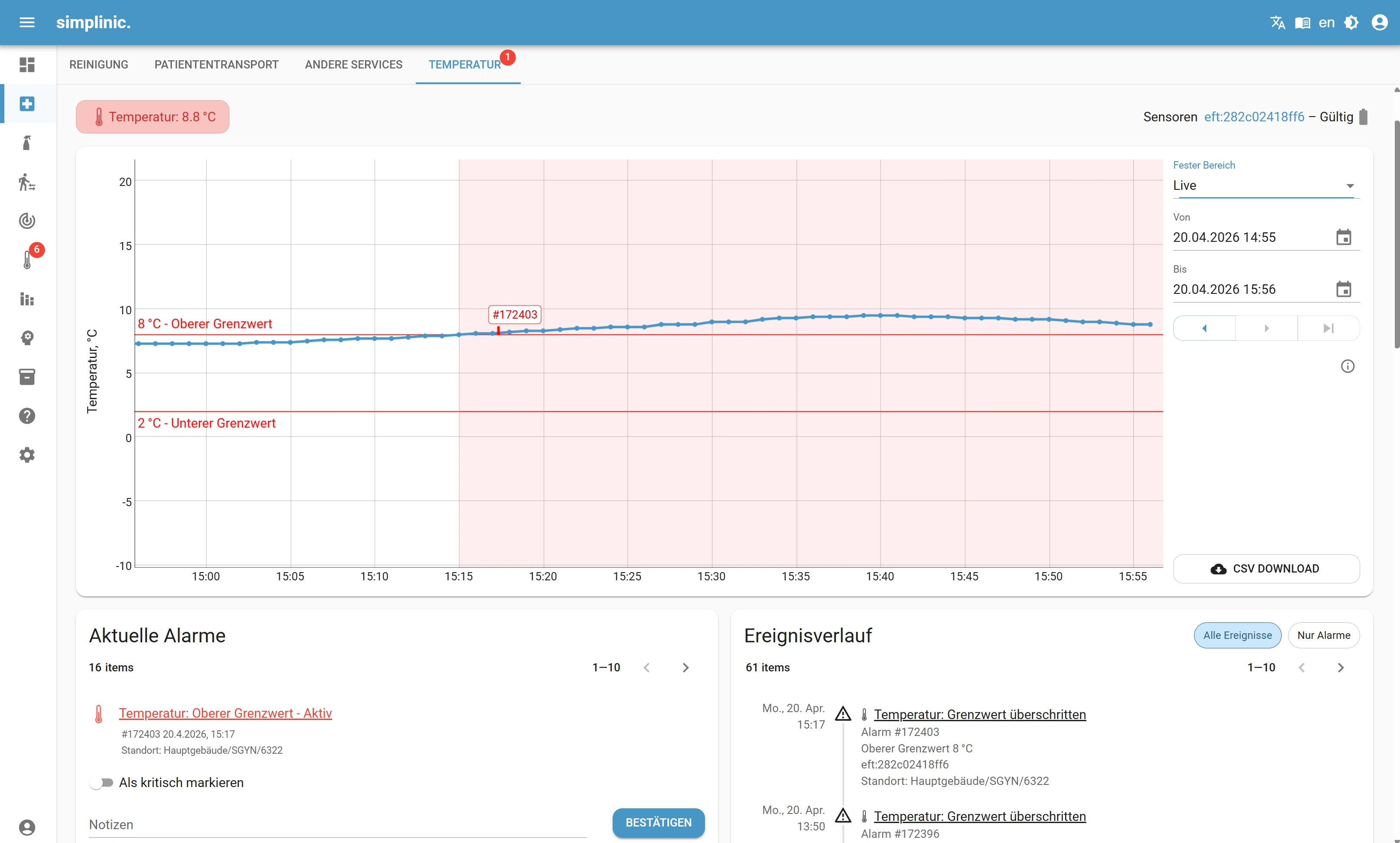 Ereignisse und Abweichungen werden fortlaufend festgehalten. So lässt sich später nachvollziehen, wann ein Problem begonnen hat, wie lange es bestand und wie darauf reagiert wurde.Für Nachweise, Prüfungen oder interne Rückfragen stehen die Verläufe direkt zur Verfügung und können exportiert werden.